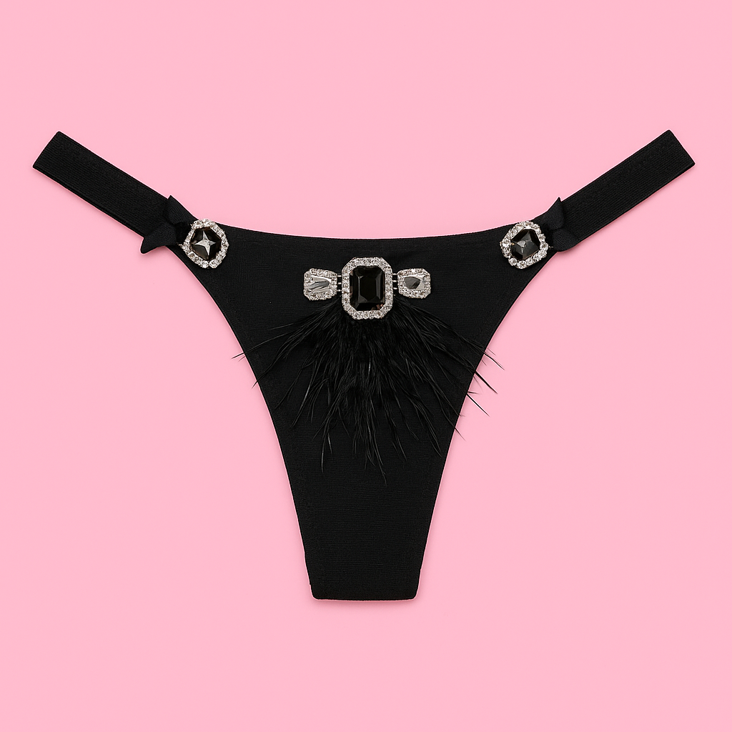 Cristalli frontali incastonati e piume nere come firma visiva centrale.